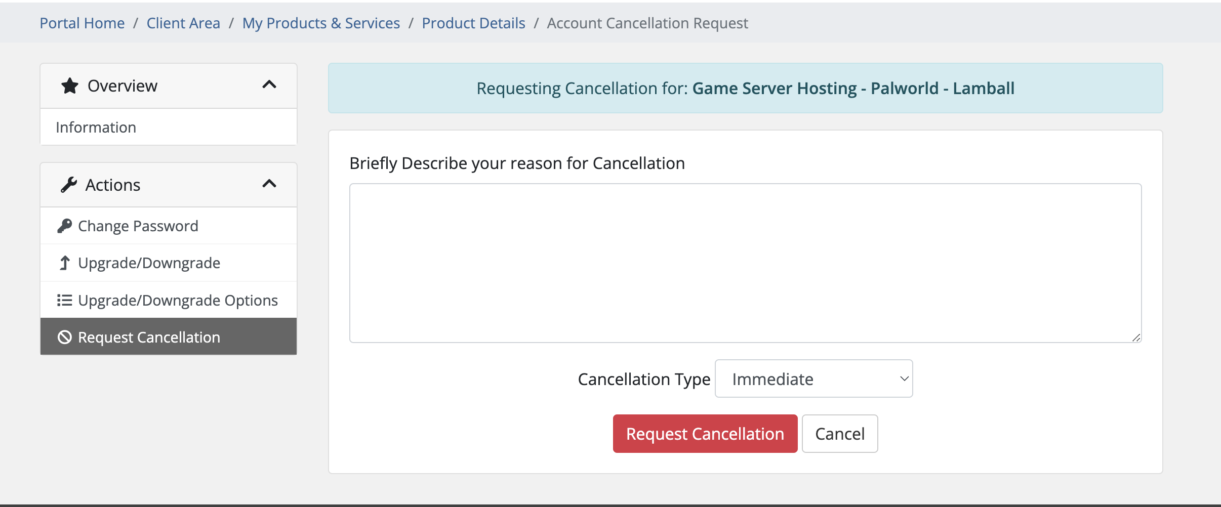 Find your active plan and choose the Request Cancellation button. Then, write a brief reason to why you’re cancelling your plan; this helps us immensely in improving our services! Finally, select between Immediate or End of Billing Period cancellation and press Request Cancellation.
