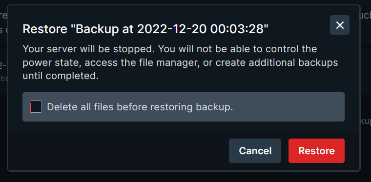 Now that you’ve created some backups, and you have a situation where you need to restore it. A bad plugin configuration, or someone raided and nuked your SMP (we’ve all been there). Restoring backups is as easy as pressing two buttons! You can press the three dots on the backup you would like to restore, and a modal will pop up asking you whether you would like to delete all files before restoring the backup. If selected, this CANNOT be reversed, so restore at your own risk. An advice would be to take a backup of the server before restoring it if you are unsure whether it may fix or break it.