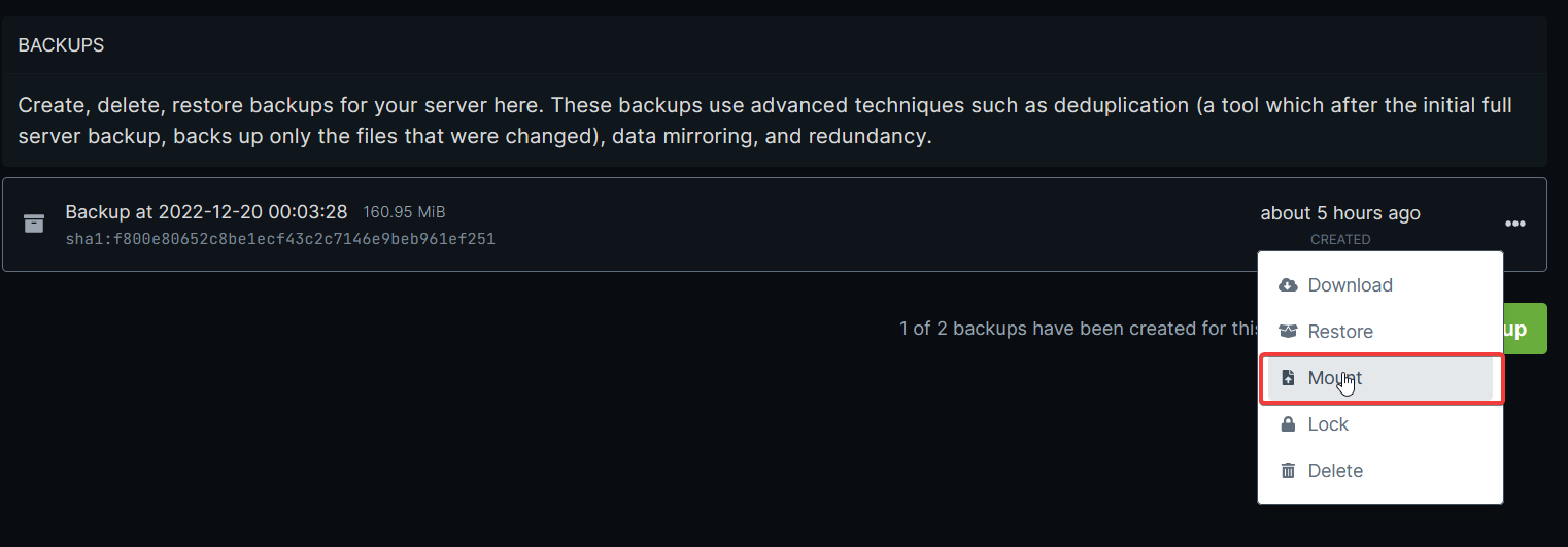 : Set a lock on the backup to prevent accidental deletions. You can toggle this by clicking the three dots on the specified backup to remove or enable the lock.